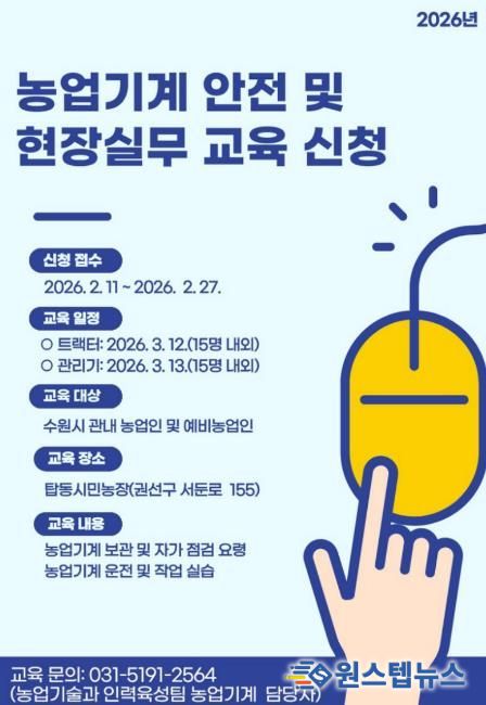 원스텝뉴스 이병희 기자 | 수원특례시는 ‘2026년 농업기계 안전 및 현장실무 교육’ 수강생을 2월 27일까지 모집한다. 관내 (예비)농업인이 참여할 수 있다.