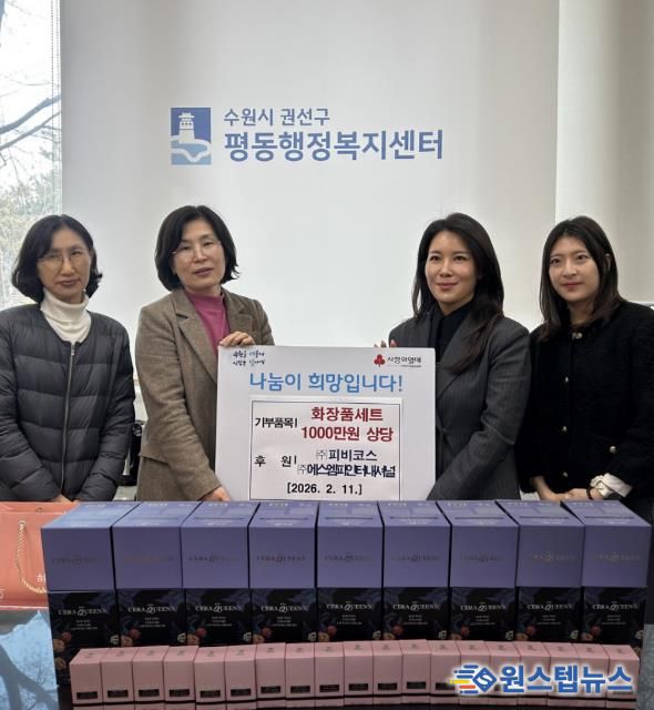 원스텝뉴스 이병희 기자 | 지난 11일, 권선구 평동 행정복지센터는 ㈜피비코스와 ㈜에스엠피인터내셔널이 약 1천만 원 상당의 세럼·크림·선크림 등 화장품세트를 공동 기부했다고 밝혔다.