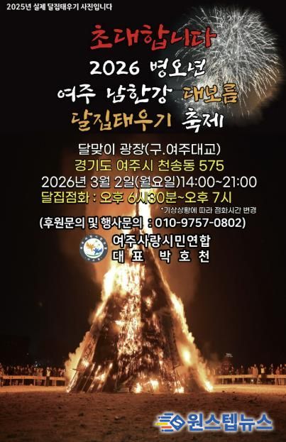 이충우 여주시장은 “정월대보름 달집태우기 행사를 통해 전통문화를 계승하고 주민 화합을 다지는 뜻깊은 시간이 되길 바란다.”며 “많은 시민들의 참여를 부탁드린다.”고 말했다.