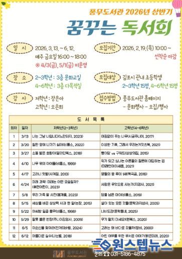 원스텝뉴스 천규영 기자 | 김포시 풍무도서관은 오는 3월 13일부터 6월 12일까지 매주 금요일 총 12회에 걸쳐 2026년 상반기 ‘꿈꾸는 독서회’를 운영한다.