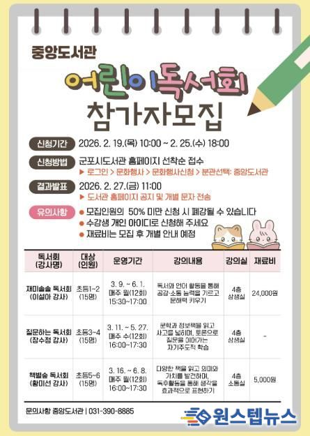 원스텝뉴스 이병희 기자 | 군포시 중앙도서관은 독서를 통해 생각하고 함께 소통하며 올바른 독서습관 형성과 문해력을 키우는 아동 및 청소년 대상 독서회를 오는 3월 9일부터 6월 13일까지 운영한다.