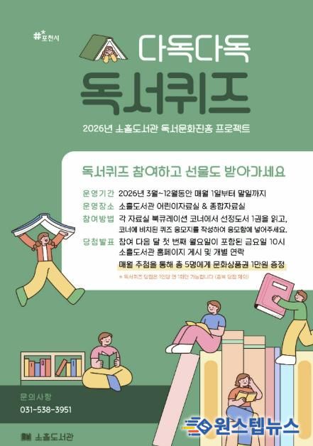원스텝뉴스 이병희 기자 | 포천시립소흘도서관은 독서 생활화와 지역사회 독서문화 확산을 위해 오는 3월부터 어린이, 청소년·일반을 대상으로 대상으로 ‘다독다독 독서퀴즈’를 운영한다.
