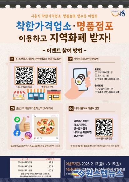 원스텝뉴스 이병희 기자 | 시흥시는 착한가격업소ㆍ명품점포 활성화와 설 명절 지역 물가안정을 위해 ‘2026년 상반기 착한가격업소ㆍ명품점포 방문 이벤트’를 2월 13일부터 3월 15일까지 진행한다.