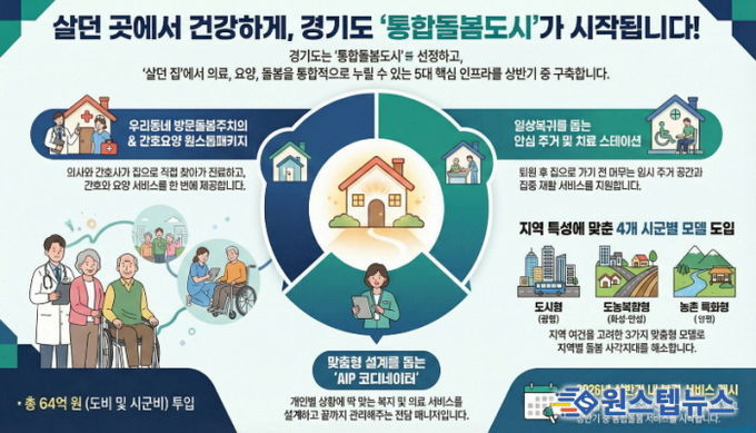 이번 사업은 오는 3월 ‘의료·요양 등 지역 돌봄의 통합지원에 관한 법률’ 시행에 앞서 각 지역의 인구 구조와 특성에 맞춘 ‘경기형 통합돌봄 모델’을 구축하려는 선제적 조치다. 경기도는 도비와 시군비 총 64억 원의 예산을 투입할 예정이다. 국정 제1 동반자로서 경기도가 통합돌봄 정책 기조를 가장 앞장서서 실천함으로써 경기도의 실행 리더십을 증명하는 의지를 담고 있다.