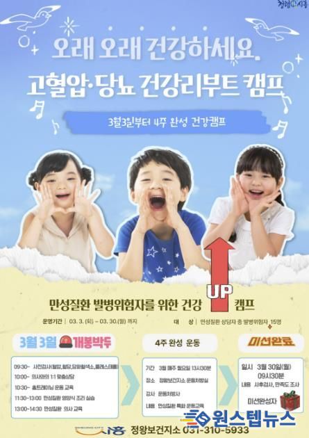 원스텝뉴스 이병희 기자 | 시흥시는 혈압ㆍ당뇨ㆍ이상지질혈증 경계 단계에 있는 시민 15명을 대상으로 만성질환 이환을 예방하기 위한 ‘고혈압ㆍ당뇨 건강 리부트 캠프’를 오는 3월 3일부터 4주간 운영한다.