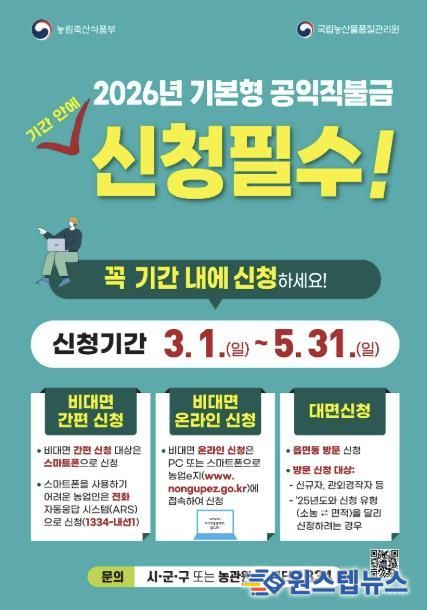 원스텝뉴스 이병희 기자 | 포천시는 오는 3월 1일부터 농업의 공익적 기능을 강화하고 농업인의 소득 안정을 지원하기 위한 ‘2026년 기본형 공익직접지불금’ 신청을 받는다.