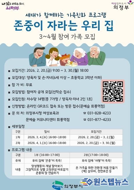 원스텝뉴스 이병희 기자 | 의정부시는 문예숲 커뮤니티센터 회룡역점(회룡역사 3층)에서 운영하는 ‘존중이 자라는 우리 집’ 프로그램 참여 가정을 2월 19일부터 선착순으로 모집한다.