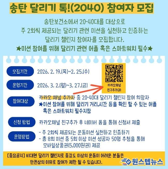 원스텝뉴스 이병희 기자 | 평택시 송탄보건소는 2월 19일부터 25일까지 달리기 실천 챌린지인 '송탄 달리기 톡!' 참여자를 모집한다고 밝혔다.