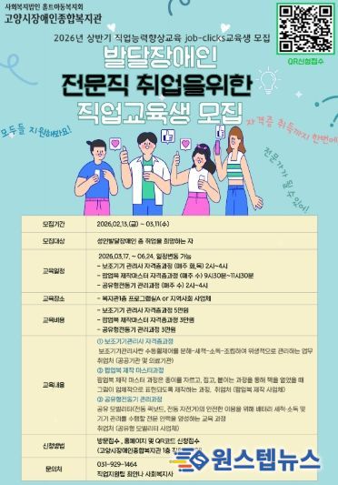 교육 신청은 3월 11일까지 복지관 1층 직업지원팀 방문 접수 또는 복지관 누리집(홈페이지)및 QR코드를 통한 온라인 접수로 가능하다.