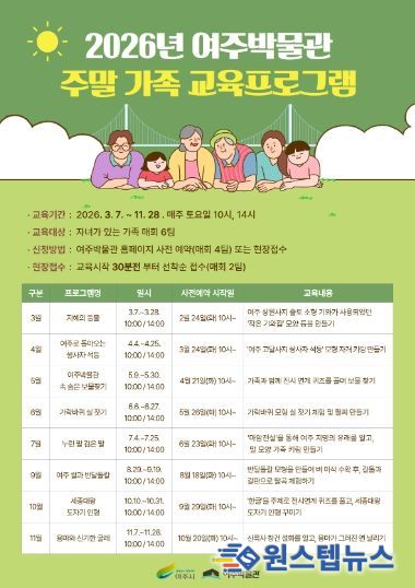 원스텝뉴스 천규영 기자 | 여주시 여주박물관은 오는 3월 7일부터 11월 28일까지 매주 토요일, 가족 단위 관람객을 대상으로 한 ‘2026년 주말 가족 대상 교육프로그램’을 운영한다.