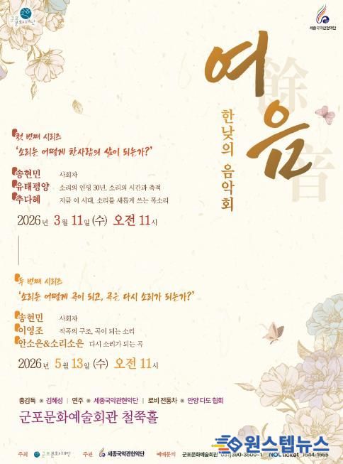 군포문화재단 전형주 대표이사는 “단순히 듣는 공연을 넘어, 아티스트가 평생을 바쳐 일궈온 '소리'라는 인생의 궤적을 시민들과 함께 사유하고 나누고 싶었다”며 “정오의 햇살처럼 따뜻한 국악의 선율이 공연이 끝난 뒤에도 시민들의 마음속에 긴 '여음'으로 남아 일상을 버티는 부드러운 힘이 되길 기대한다”고 전했다.