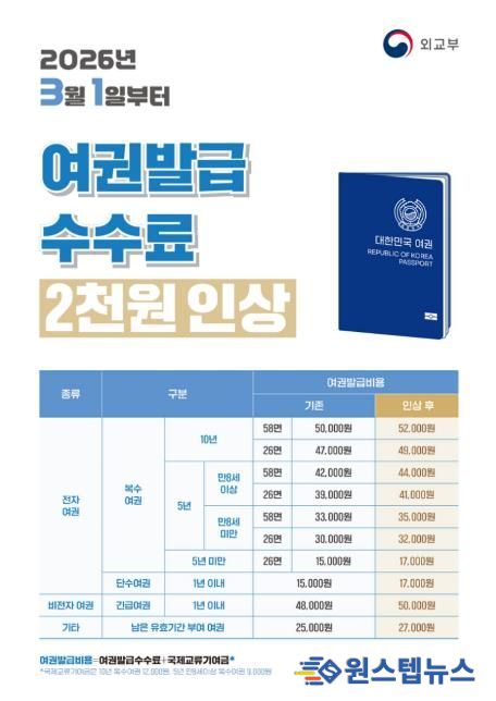 이는 외교부의 여권법 시행령 개정에 따른 조치로, 유효기간 10년 복수여권 기준 58면은 기존 5만 원에서 5만 2천 원으로, 26면은 4만 7천 원에서 4만 9천 원으로 각각 조정된다.