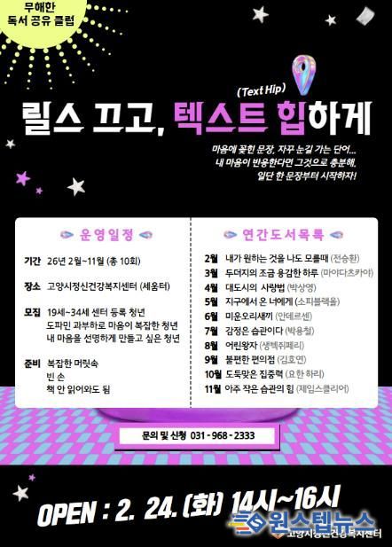 원스텝뉴스 이병희 기자 | 고양시정신건강복지센터는 만19~34세 등록청년을 대상으로 ‘무해한 독서 공유 클럽’(릴스 끄고, 텍스트 힙하게)을 매달 운영한다.