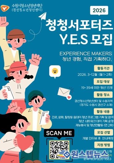 원스텝뉴스 이병희 기자 | 수원시청소년청년재단 권선청소년청년센터는 청년이 문화 프로그램의 기획과 운영 과정에 주도적으로 참여하며 또래 간 네트워크를 형성하고, 이를 통해 지역사회에 긍정적인 에너지를 확산할 수 있도록 돕는 '2026 청청서포터즈 YES(Youth Energy Supporters)' 참가자를 모집한다.