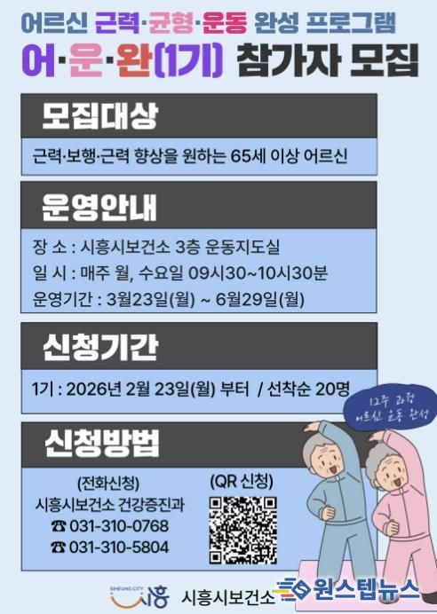 원스텝뉴스 이병희 기자 | 시흥시는 어르신들의 근력 향상과 낙상 예방을 위해 ‘어르신 근력ㆍ균형 운동 완성 프로그램(이하, 어ㆍ운ㆍ완)’ 1기 참가자를 모집한다.