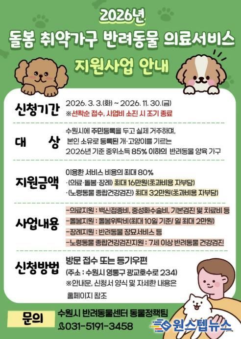 원스텝뉴스 이병희 기자 | 수원특례시는 돌봄 취약가구의 반려동물 양육 부담을 덜고 동물복지를 강화하기 위해 ‘2026년 돌봄 취약가구 반려동물 의료서비스 지원사업’을 추진한다.