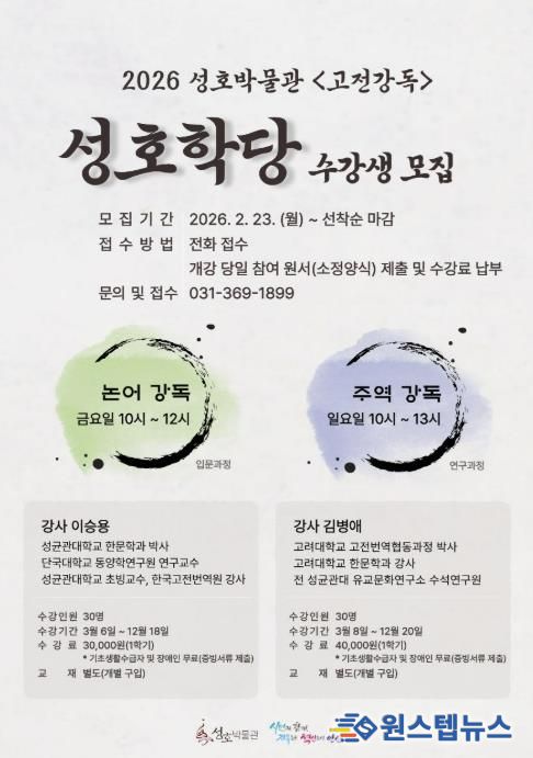 수강 신청은 오는 23일부터 전화로 선착순 접수하며, 자세한 사항은 성호박물관 누리집에서 확인할 수 있다.