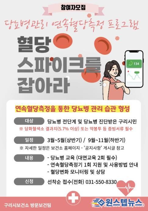 원스텝뉴스 이병희 기자 | 구리시 보건소는 2월 23일부터 당뇨병관리 연속혈당측정 프로그램 '혈당 스파이크를 잡아라'의 참여자를 모집한다고 밝혔다.