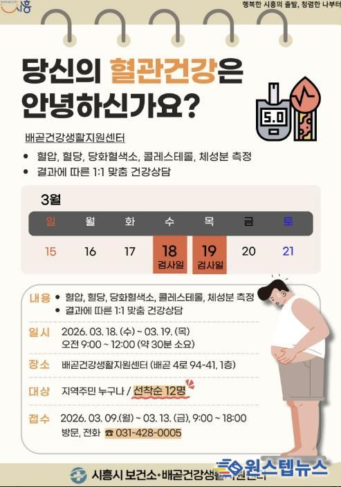 원스텝뉴스 이병희 기자 | 시흥시보건소 배곧건강생활지원센터는 지역 주민의 심뇌혈관질환 예방과 고지혈증(이상지질혈증) 관리를 위한 집중 교육 프로그램 ‘혈관 건강 톡톡(Talk Talk)’을 오는 3월부터 운영한다.