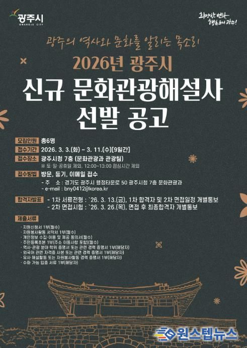 원스텝뉴스 이병희 기자 | 광주시는 2026년도 광주시 문화관광 해설사 신규 선발을 위해 오는 3월 3일부터 11일까지 원서 접수를 실시한다고 25일 밝혔다.