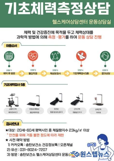 두 가지 측정 프로그램 모두 송탄보건소 1층 헬스케어상담센터에서 진행되며, 예약은 카카오톡 채널 ‘송탄보건소 건강정보톡!’또는 전화로 가능하다.