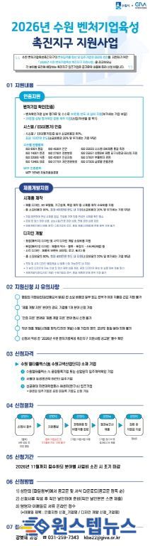원스텝뉴스 이병희 기자 | 수원특례시가 수원 벤처기업육성촉진지구 내 중소·벤처기업을 대상으로 인증과 제품 개발을 지원하는 ‘2026년 수원 벤처기업육성촉진지구 활성화사업’에 참여할 기업을 모집한다.