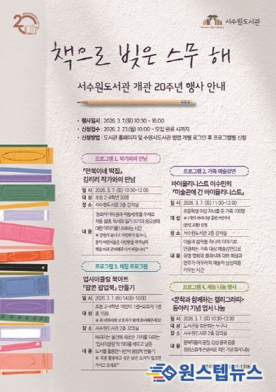 원스텝뉴스 천규영 기자 | 수원시 서수원도서관이 개관 20주년을 맞아 3월 7일 오전 10시 30분부터 기념행사 ‘책으로 빚은 스무 해’를 개최한다.
