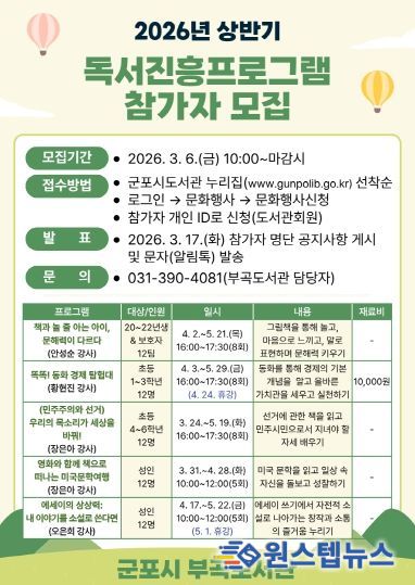 원스텝뉴스 천규영 기자 | 군포시 부곡도서관은 지역 주민들에게 올바른 독서 환경을 제공하고 책 읽는 즐거움을 선사하기 위해 ‘2026년 상반기 독서진흥프로그램’을 운영한다고 밝혔다.
