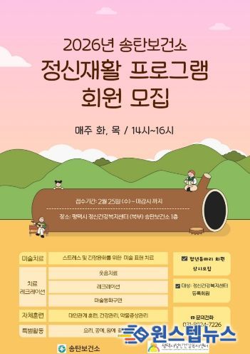 원스텝뉴스 이병희 기자 | 평택시 정신건강복지센터(송탄보건소)는 만 19세 이상 등록회원을 대상으로 ‘2026년 정신재활 프로그램’을 운영한다고 밝혔다. 이번 프로그램은 정신질환자의 사회적응 능력을 키우고 정신건강 증진을 도모하기 위해 마련됐다.
