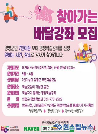 원스텝뉴스 천규영 기자 | 양평군은 지난 2월 20일까지 ‘2026년 상반기 찾아가는 배달강좌’ 평생학습 학습모임을 모집한 결과, 총 29개 팀을 심사해 20개 팀을 최종 선정했다고 밝혔다.
