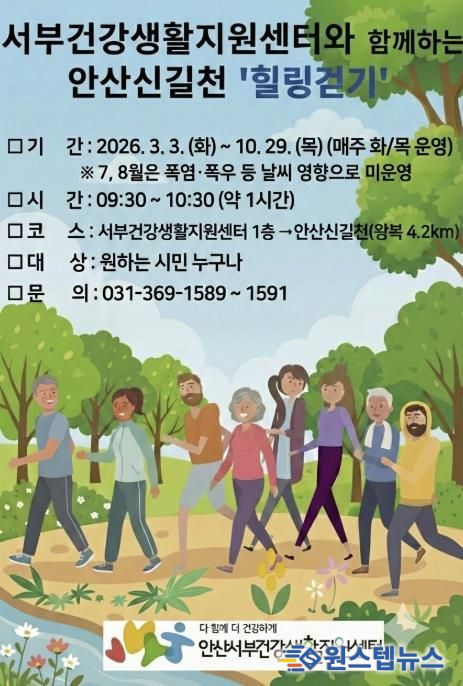 원스텝뉴스 이병희 기자 | 안산시 단원보건소 서부건강생활지원센터는 오는 3월 3일부터 10월 29일까지(7~8월 제외) ‘안산신길천 힐링 걷기 프로그램’을 운영한다고 27일 밝혔다.