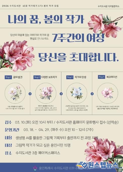 원스텝뉴스 이병희 기자 | 용인특례시 수지도서관은 오는 3월 18일부터 운영하는 시민 작가 양성 프로그램 ‘나의 꿈이 책이 되는 7주간의 여정, AI로 그림책 작가 되기’ 1기 참여자를 모집한다고 27일 밝혔다.