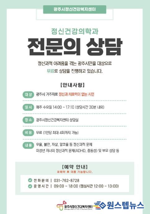 원스텝뉴스 이병희 기자 | 광주시정신건강복지센터는 지역 주민의 정신건강 증진과 심리지원 강화를 위해 2월부터 정신건강의학과 전문의 무료 상담을 운영하고 있다고 27일 밝혔다.