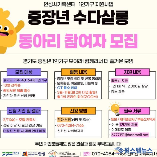 원스텝뉴스 이병희 기자 | 안성시 가족센터는 경기도 거주 중장년 1인 가구(40세~64세)를 대상으로 사회적 관계망 형성을 위한 ‘중장년 수다살롱’ 동아리 참여자를 모집한다.