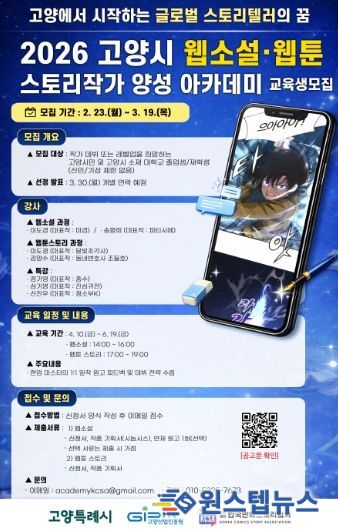 원스텝뉴스 이병희 기자 | 고양산업진흥원이 웹콘텐츠 산업을 이끌어갈 스토리 전문 인재 발굴을 위한 ‘2026 고양시 웹소설·웹툰 스토리작가 양성 아카데미’ 교육생을 모집한다.