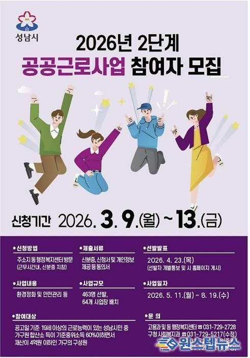원스텝뉴스 이병희 기자 | 성남시는 오는 3월 9일부터 13일까지 ‘2026년도 2단계 공공근로사업’ 참여 희망자 463명을 모집한다.