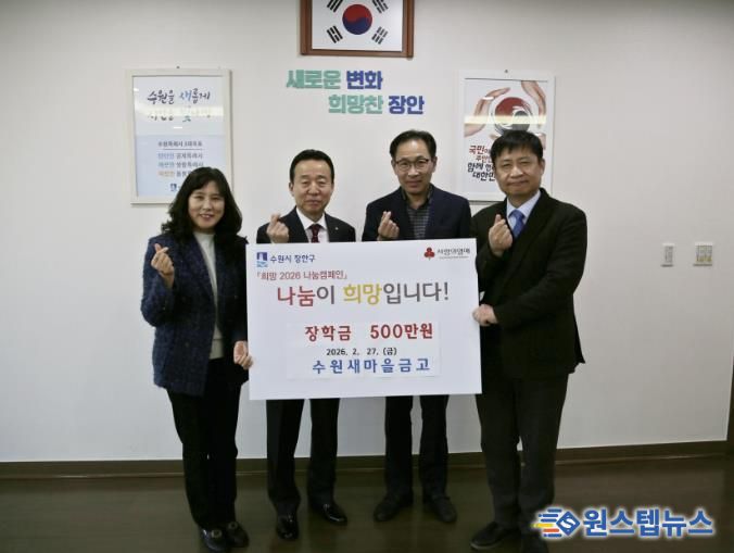 원스텝뉴스 이병희 기자 | 수원새마을금고는 지난 27일, 2026년 신학기를 맞아 수원시 장안구 관내 중·고등학생 10명에게 1인당 50만원씩, 총 500만원의 장학금을 후원했다고 밝혔다.