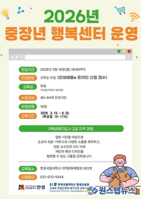 원스텝뉴스 이병희 기자 | 안성시는 중장년층의 취업·창업 역량 강화를 위해 ‘2026년 중장년 행복센터 가죽공예지도사 2급 자격과정’을 개설하고 3월 3일부터 수강생을 모집한다.