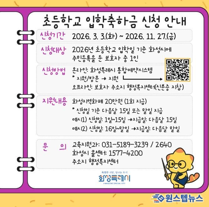 원스텝뉴스 이병희 기자 | 화성특례시는 2026학년도 초등학교 1학년 입학생을 대상으로 ‘초등학교 입학축하금 지원사업’을 시행한다.