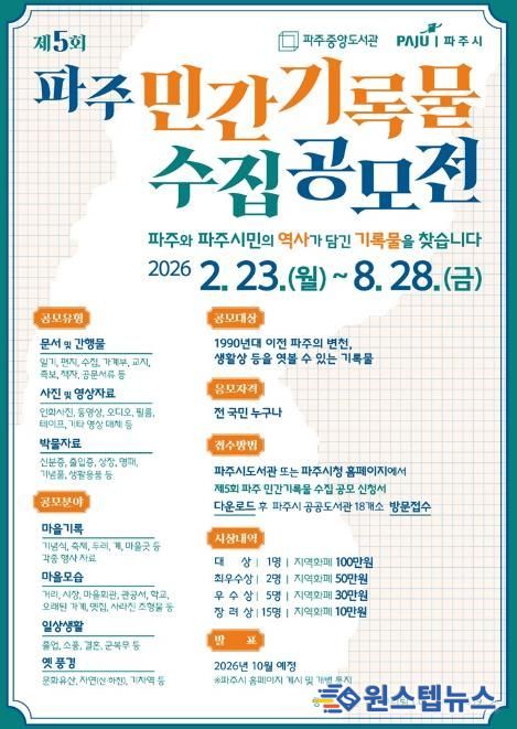 원스텝뉴스 이병희 기자 | 파주시 중앙도서관은 시민의 삶 속에 남아 있는 기록을 통해 지역의 역사를 되살리고자 2월 23일부터 8월 28일까지 ‘제5회 파주 민간기록물 수집 공모전’을 개최한다.