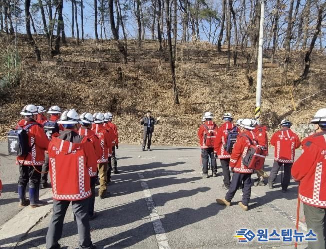 훈련은 △산불 발견 및 상황 전파 △초동 출동 및 현장 도착 △화선 확대에 따른 대응 △주불 진화 및 확산 차단 △잔불 정리 및 재발화 방지 등 전 과정을 체계적으로 점검하는 방식으로 실시됐다. 특히 개인 진화장비 착용 상태 확인, 무전기를 활용한 통신체계 운용, 등짐펌프 등 진화장비 사용 숙달, 조별 진화 전개 훈련 등을 통해 현장 대응 능력을 집중적으로 강화했다.