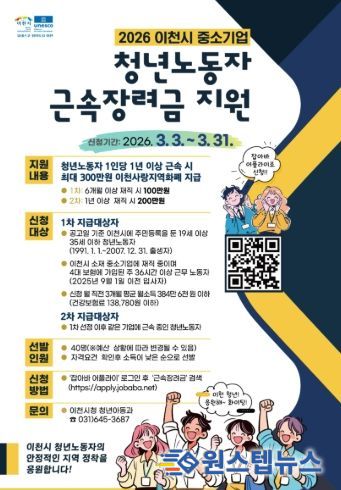 원스텝뉴스 이병희 기자 | 이천시는 3월 3일부터 3월 31일까지 2026년 상반기 이천시 중소기업 청년노동자 근속장려금 지원사업 참여자를 모집한다고 밝혔다.