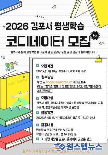 원스텝뉴스 이병희 기자 | 김포시가 시민중심의 평생학습 체계 강화를 위해 ‘2026년 평생학습 코디네이터’를 공개 모집한다.