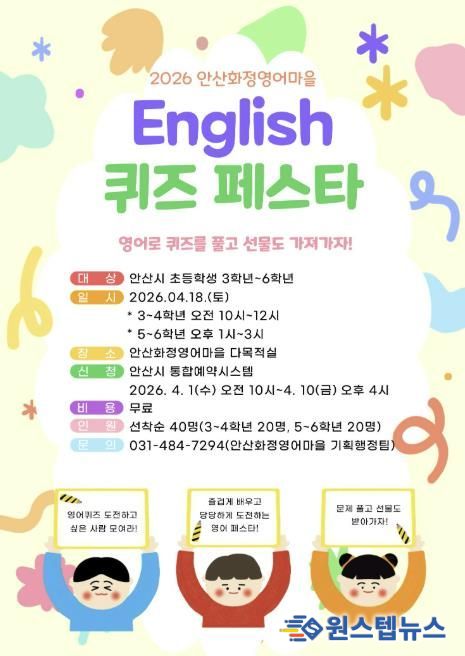 원스텝뉴스 이병희 기자 | 안산시가 설립하고 안산대학교가 운영하는 안산화정영어마을은 4월 1일부터 4월 10일까지 원어민과 함께하는 ‘English 퀴즈 페스타’ 참가자를 선착순 모집한다고 5일 밝혔다.