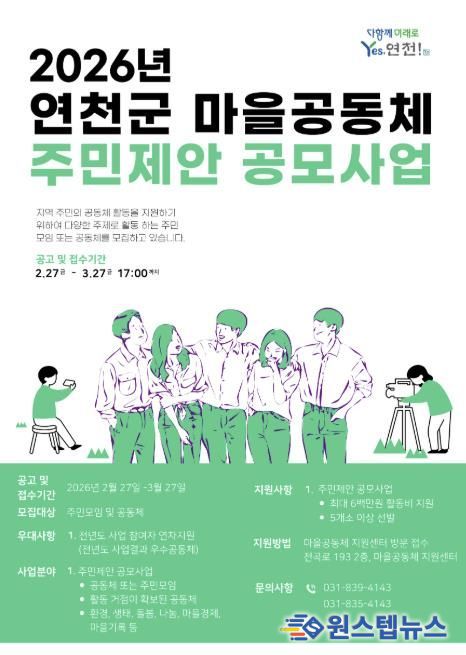 원스텝뉴스 이병희 기자 | 연천군이 주민 모임과 공동체를 대상으로 ‘2026년 연천군 마을공동체 주민제안 공모사업’ 참여단체를 모집한다.