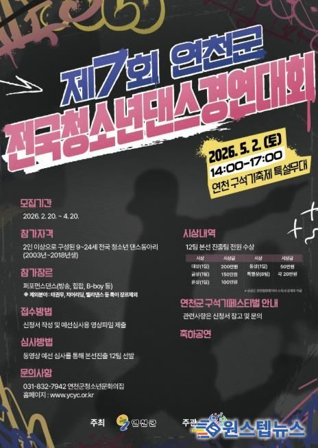 원스텝뉴스 이병희 기자 | (재)연천군청소년육성재단(청소년문화의집)은 전국 청소년들이 꿈과 열정을 마음껏 펼칠 수 있는 무대를 마련하고, 창의적인 문화예술 활동을 확산하기 위해 제7회 연천군 전국청소년댄스경연대회를 개최한다고 밝혔다.