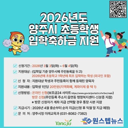원스텝뉴스 이병희 기자 | 양주시가 지역 내 초등학교 1학년에 입학하는 신입생 가정의 교육비 부담을 경감하고 교육복지 실현을 위해 ‘2026년 초등학교 입학축하금 지원사업’을 추진한다.