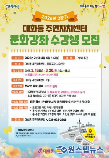 원스텝뉴스 이병희 기자 | 고양특례시 일산서구 대화동 주민자치회는 주민들의 문화적 욕구를 충족하고 삶의 질을 높이기 위해 오는 3월 16일부터 20일까지 ‘2026년 2분기 문화강좌’ 수강생을 모집한다.