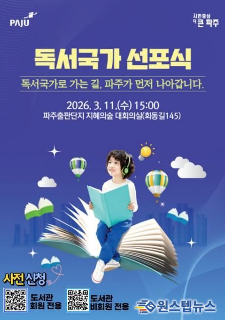 원스텝뉴스 천규영 기자 | 파주시는 오는 11일 15시, 파주출판도시 지혜의숲 대회의실에서 ‘파주시 독서국가 선포식’을 개최하고 책 읽는 도시를 넘어 ‘독서국가’로 나아가기 위한 힘찬 출발을 알린다.