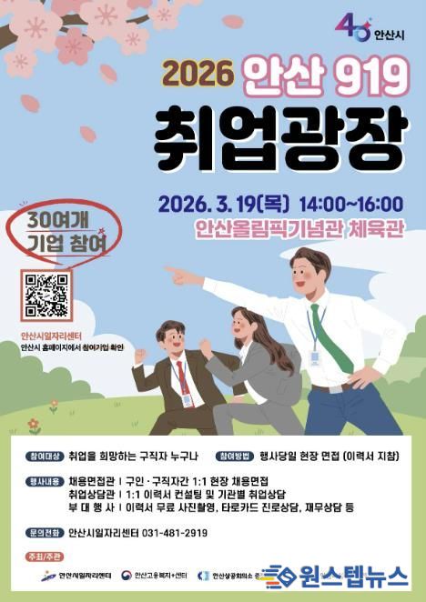 원스텝뉴스 이병희 기자 | 안산시는 오는 19일 안산올림픽기념관 체육관에서 구인기업의 인력난 해소와 구직자의 취업 기회 확대를 위한 ‘안산 919취업광장’을 개최한다고 6일 밝혔다.